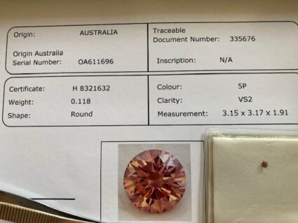 We are offering to our customers, the opportunity to purchase a matching pair of cut and polished Argyle Pink Diamonds. Over 10 points each in carat weight and a good colour range of 5P, these two would make a very nice pair of stud earrings or sit alongside a single diamond setting. Speak to a us and we can suggest a jeweller, who will work with you, to design your own bespoke piece of jewellery. Buying an Argyle Pink Diamond, is an Australian diamond investment.