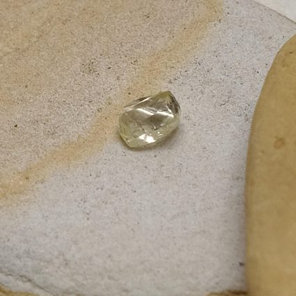 An elongated octahedral diamond, lovely clear pale-yellow, though un-cut it has a definite sparkle. Certainly, an eye catcher. Due to the shape, it looks bigger than it really is, though at 0.63ct, it’s not small!